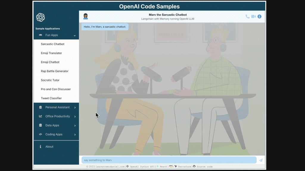 A React + AWS Serverless full stack implementation of the example applications found in the official OpenAI API documentation. See this system architectural diagram for details. This is an instructional tool for the YouTube channel "Full Stack With Lawrence" and for University of British Columbia course, "Artificial Intelligence Cloud Technology Implementation".
