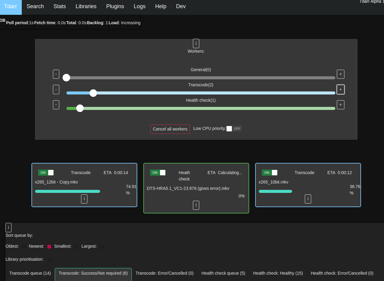 Tdarr is a self hosted web-app for automating media library transcode/remux management and making sure your files are exactly how you need them to be in terms of codecs/streams/containers etc. Designed to work alongside Sonarr/Radarr and built with the aim of modularisation, parallelisation and scalability, each library you add has its own transcode settings, filters and schedule. Workers can be fired up and closed down as necessary, and are split into 3 types - 'general', 'transcode' and 'health check'. Worker limits can be managed by the scheduler as well as manually. For a desktop application with similar functionality please see HBBatchBeast.