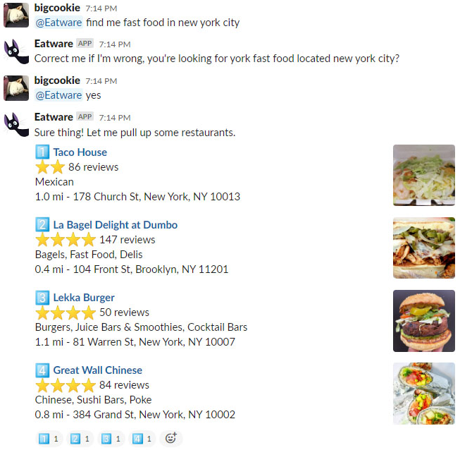 Eatware is a Slackbot that helps you and your team find and vote on nearby places to eat. Developed for the NCR Hackathon 2020, it uses Dialogflow to receive requests from Slack and process user intents and requirements from natural language. This repository is the API that Dialogflow makes requests to once parameters are received, and will respond to Slack with a formatted payload using Slack Blocks.