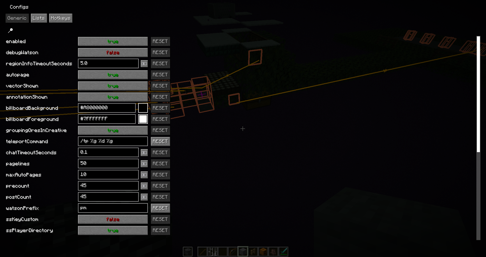 Watson's main configuration settings are stored in ".minecraft/config/watson.json". They can be changed using the "/w config" command. If a setting can be either "on" or "off", omitting a value for it in "/w config" will reverse the current value. If the setting has a value that can't be toggled in this way, "/w config settingname" will show its current value. There is also a gui when you press the default hotkey "L + C".
