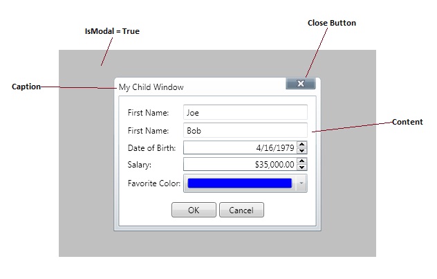 | Caption | Gets or sets the caption of the ChildWindow. (Inherited from Xceed.Wpf.Toolkit.Primitives.WindowControl) |